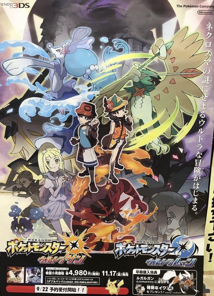 En Japón ha aparecido un póster promocional de Pokémon Ultrasol y Ultraluna en él podemos ver a los entrenadores protagonistas, así como a otros personajes reconocibles como Lylia o Gladio. También podemos ver las últimas evoluciones de los Pokémon iniciales de Alola junto a las nuevas formas de Solgaleo y Lunala en este juego.