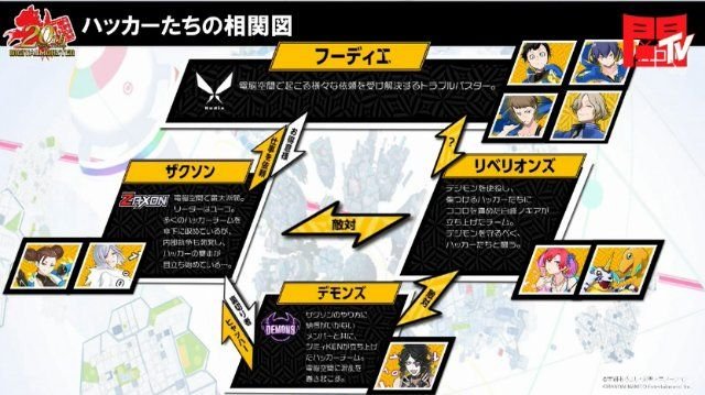 Gráfico de relaciones de personajes basado en equipos de hackers en Digimon Cyber Sleuth Hacker’s Memory